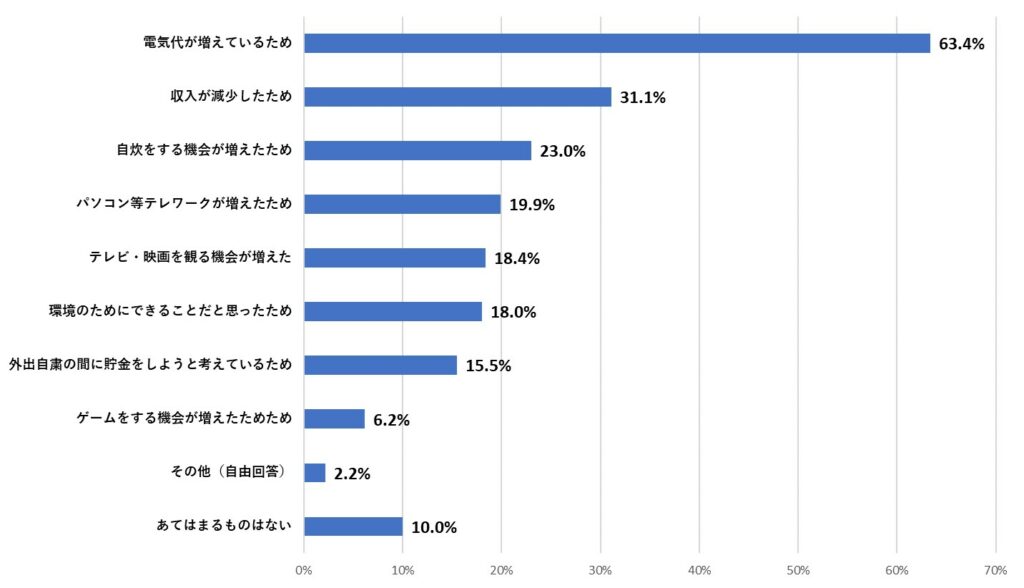 49.6%が昨年より「節電に対する意識が高くなった」と回答しており、ステイホーム時間が急激に伸びた昨年より、さらに高まっていることが分かります。「意識が高くなった」と回答した人に理由を質問したところ、63.4%が「電気代が増えたため」と回答しました。次いで、31.1%が「収入が減少したため」と回答しており、長期化するコロナ禍で経済的な影響から意識が高まったことがわかります。
