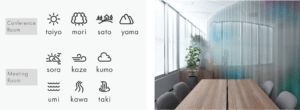 アイ・グリッドが大切にしているビジネスポリシーのひとつに「自然を傷つけない再エネの追求」があります。満ちる光を表現したカーテンが揺れるラウンジエントランスから、エネルギーがめぐって未来にサステナブルな活力がうまれることをイメージし、会議室には、自然にまつわる名前をつけました。