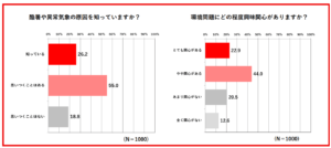 次に「酷暑や異常気象の原因」についての質問では、「具体的に知っている」と回答した人は26.2%、「思いつくことはある」と答えた人は 55.0%で、合計 81.2%の人が何らかの形で原因を意識していることが分かりました。これは、多くの人が単なる暑さの変化ではなく、その背景に要因があると認識していることを示しています。