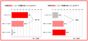 さらに「地球温暖化に関する認識」について、「地球温暖化」という言葉を知っている、または聞いたことがあると答えた人は 95.7%、それに対し、地球温暖化の進行による影響が危機的な状況であることを伝えるために、国連のグテーレス事務総長が使用した「地球沸騰化」という言葉を知っている、聞いたことがあると答えた人は 56%にとどまりました。「地球温暖化の時代は終わり、地球沸騰化の時代が到来した」という国連の警鐘はまだ、一般的に行き届いていないようです。