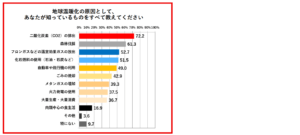また、地球温暖化の原因として知っているものを挙げてもらったところ、「二酸化炭素(CO2)の排出」が 72.2%で最も多く、次いで「森林伐採」が 61.3%、「フロンガスや温室効果ガスの放出」が52.7%となりました。この結果からも、温暖化の科学的背景に対する認識も一定程度浸透していること