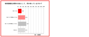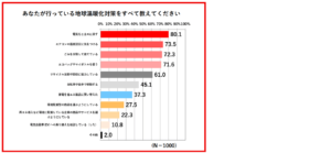 さらに、「知っていて対策もしている」と答えた人に、実際に行っている対策を挙げてもらったところ、「電気をこまめに消す」が 80.1%で最も多く、続いて「エアコンの温度設定に気を付ける」73.5%、「ごみを分別して捨てる」72.3%と、手軽にできる環境対策を実践している人が多いことが分かりました。その他にも、省エネ家電への買い替えや、自転車・徒歩での移動など、自然環境への配慮を意識した行動が見られました。