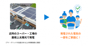 アイ・グリッドは、スーパーや工場など法人施設の屋根を中心に太陽光発電設備を設置することで、自然を傷つけない屋根上の太陽光発電所として、全国46都府県に約1,300か所以上の開発を行っています。屋根上で発電した太陽光の電気は施設内で優先的に使われますが、時間帯によっては消費量より発電量の方が多くなることがあります。