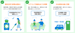 土日昼間の電力量料金単価が無料時間に、「まとめて家事をする」「お家時間を贅沢に楽しむ」「EVを充電してドライブを無料で楽しむ」といった新しい電気の使い方が広がります。エコな行動を「我慢の節電」ではなく、日常に自然に溶け込む、楽しい体験へと転換します。