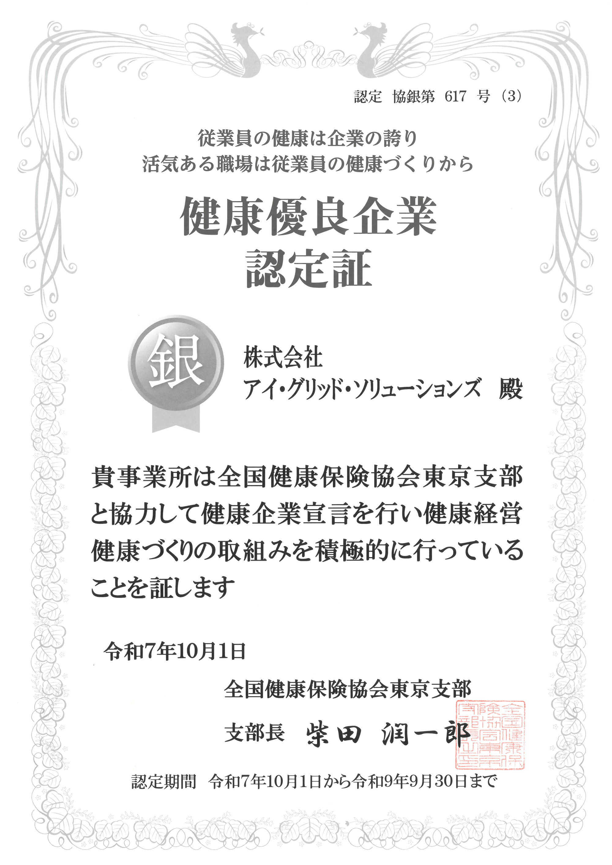 アイ・グリッド・ソリューションズは、全国健康保険協会東京支部に「健康企業宣言 ※」を行い、積極的な健康経営への取り組みを実施し、健康経営に向けた取り組みが評価され、令和7年10月1日付で「健康優良企業(銀の認定)」を取得いたしました。(認定 協銀第617号)