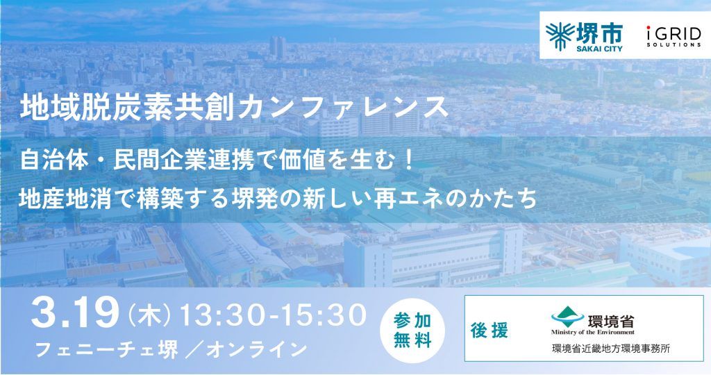 株式会社アイ・グリッド・ソリューションズ(本社:東京都港区、代表取締役社長:秋田 智一、以下「アイ・グリッド」)は、2026年3月19日(木)に、堺市と共同で地域脱炭素共創カンファレンスを開催します。