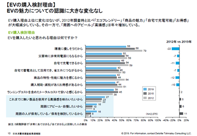 EVの購入動機について、デロイトトーマツコンサルティングによる「次世代に関する消費者意識調査結果(2019年)」によると実際にEVの購入動機の1位は「環境にやさしそうだから」です。