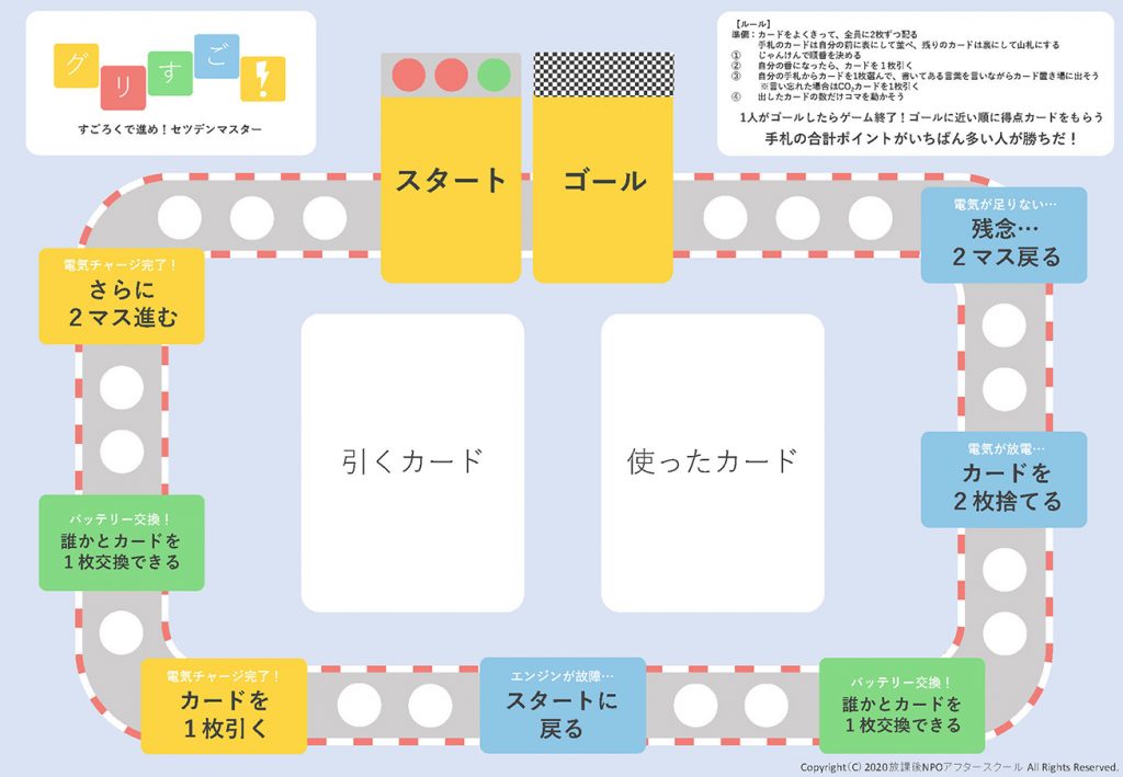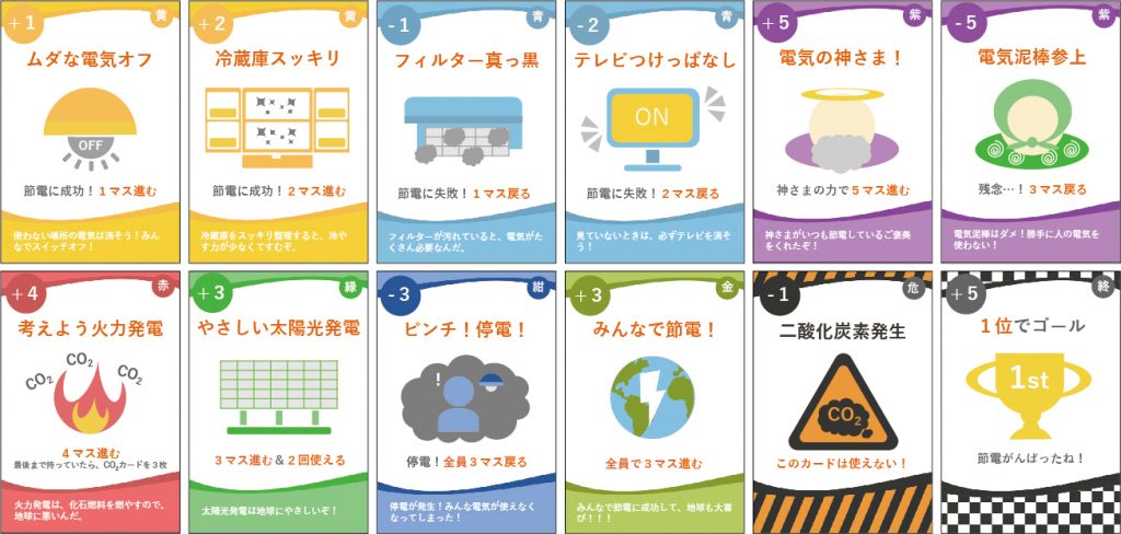 カードには電力発電の種類や子供たちが日常の中でできる節電方法が書かれており、地球環境に良いこと、良くないことを考えながら駒を進めていきます。