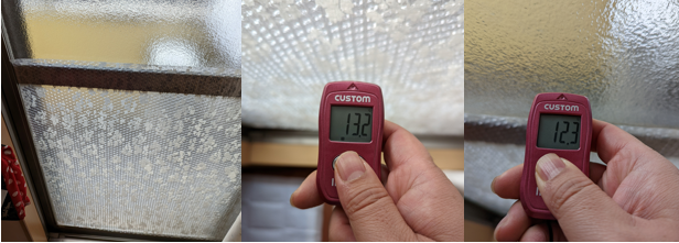 我が家では、リビングの窓の下半分に緩衝材・梱包材として使われている「ぷちぷち」を貼っております。このぷちぷちにどれぐらいの効果があるのか、窓の表面温度を測ってみました。