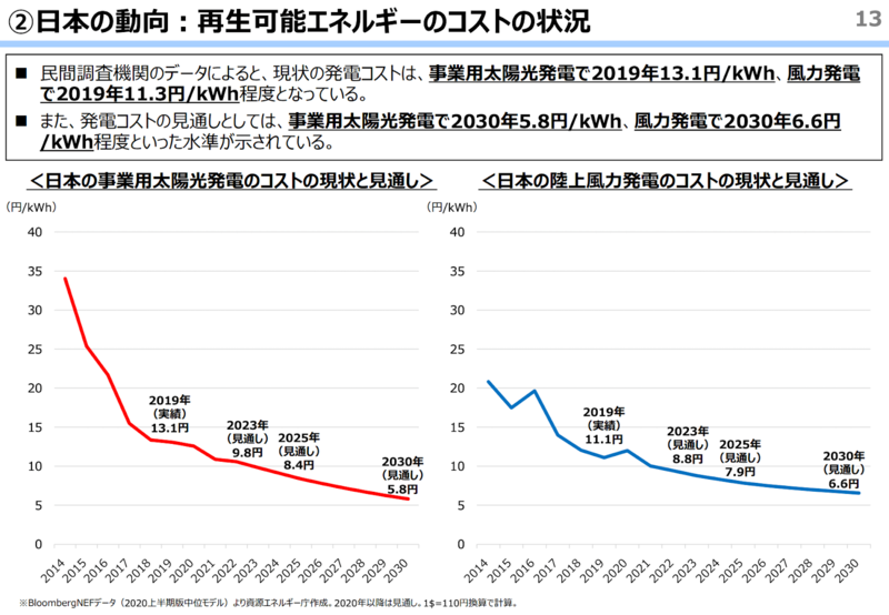 技術進歩とともに、再生可能エネルギーを導入するコストが低下したことも重要な観点です。