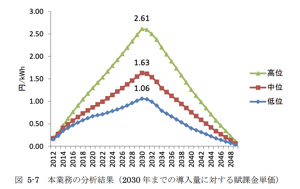 再エネ賦課金は年々上昇傾向にあり、国民の負担となっています。環境省は下のグラフのように2030年のピーク時に再エネ賦課金が2.61になると予想していましたが、2025年時点で3.98円であり、すでに高位の予想を上回っています。