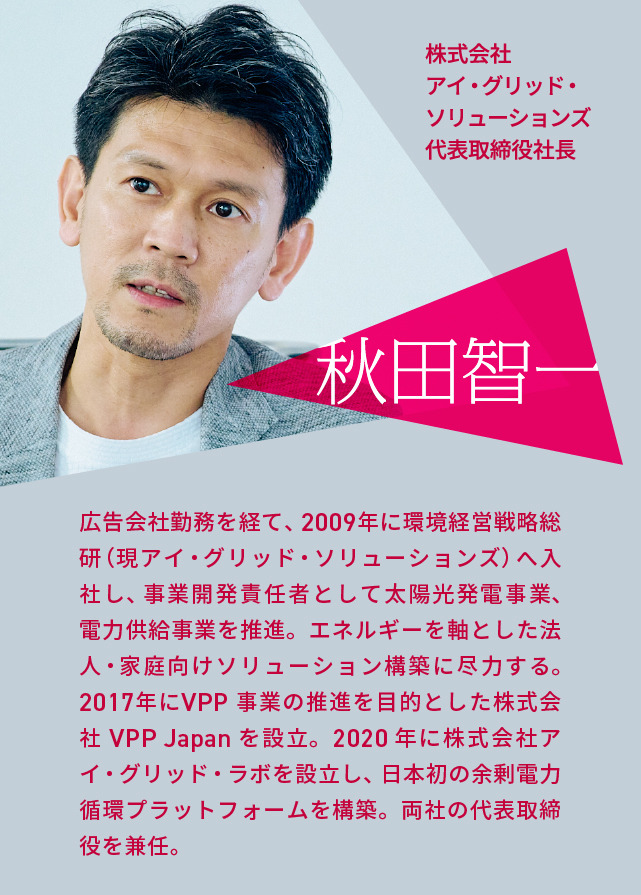 エネルギーを「減らす・創る・繋ぐ・活かす」ことで、一気通貫のエネルギーソリューションを提供しているアイ・グリッド・ソリューションズ代表取締役社長の秋田智一氏と企業の可能性をブーストさせ、「サステナブルな社会であることの最適分配」を目指すシニフィアン共同代表の村上誠典氏だ。