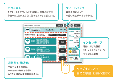 エナッジは、リチャード・セイラーが提唱する行動経済学手法「ナッジ理論」を取り入れた画面設計で、自発的な省エネ行動を促しています。省エネアクションを表示するタブレットは従業員の出入りする場所に設置し、一目で店舗の状況や今日やるべき省エネ「TODO」がわかるような画面になっています。従業員は画面をタップすることで、自然と学習し省エネ行動を促され、活動に応じた評価(ポイントやランキング)でモチベーションアップにもつながり、省エネ行動を定着させていきます。