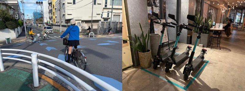 “江東区の道路と矢羽根”と”カフェに設置された電動キックボード”