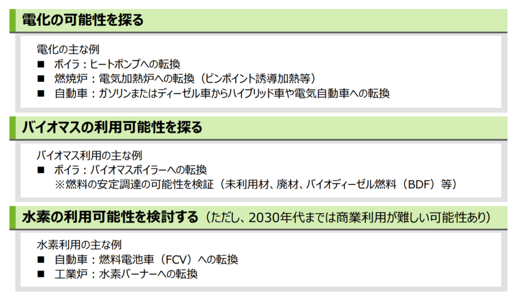 燃料消費に伴う温室効果ガス排出量を、省エネ対策のみで大幅に削減することは困難であり、温室効果ガスの排出量がゼロもしくは少量のエネルギーに転換していくことが必要です。そのため、脱炭素経営の検討に際しては、将来の技術開発動向も見据えつつ、主要設備のエネルギー転換について検討しなくてはなりません。