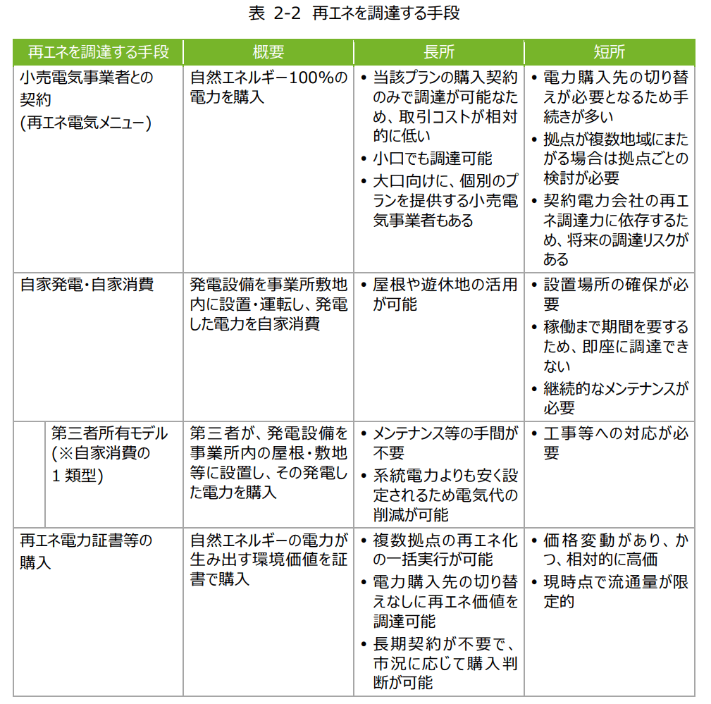 また、前ステップまでの検討の結果、自社の排出量が削減目標に届かない場合には、電気を再エネに切り替える追加施策の検討が必要です。 再エネ電気の調達方法は、一般的に以下の通り整理されます。