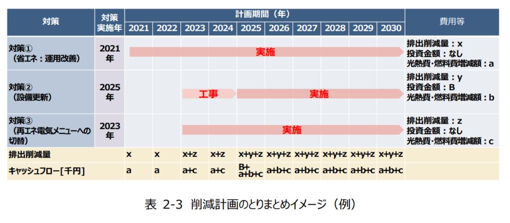 削減計画は、以下のような表で取りまとめるといいでしょう。