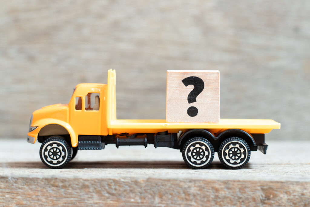 Toy truck hold alphabet letter block question mark on wood background