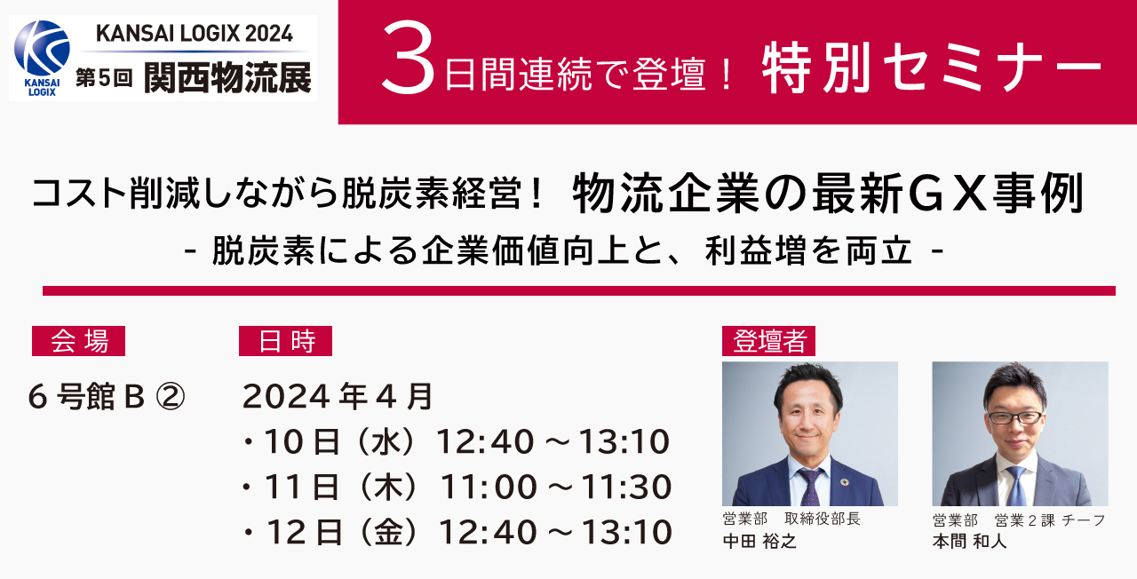 当社は2024年4月10日(水)から4月12日(金)まで、インテックス大阪 で開催される『第5回 関西物流展』 に出展いたします。2024年問題、燃料費高騰、脱炭素、BCP対策等、多様化する経営課題を抱える物流業界のみなさまに、当社のGX LogisticsⓇをご提案します。