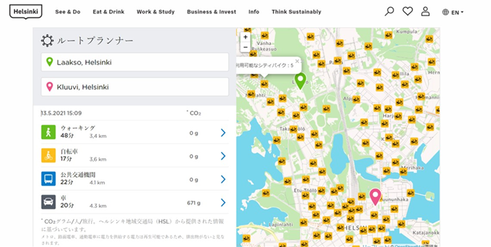 また、このサイト内にある「ルートプランナー」では、出発地から目的地まで検索すると、可能な限り最小な二酸化炭素排出量となる移動手段を教えてくれます。一人当たりのCO2排出量も表示され、環境を配慮した旅行へと誘導してくれます。(https://www.myhelsinki.fi/en/for-media)