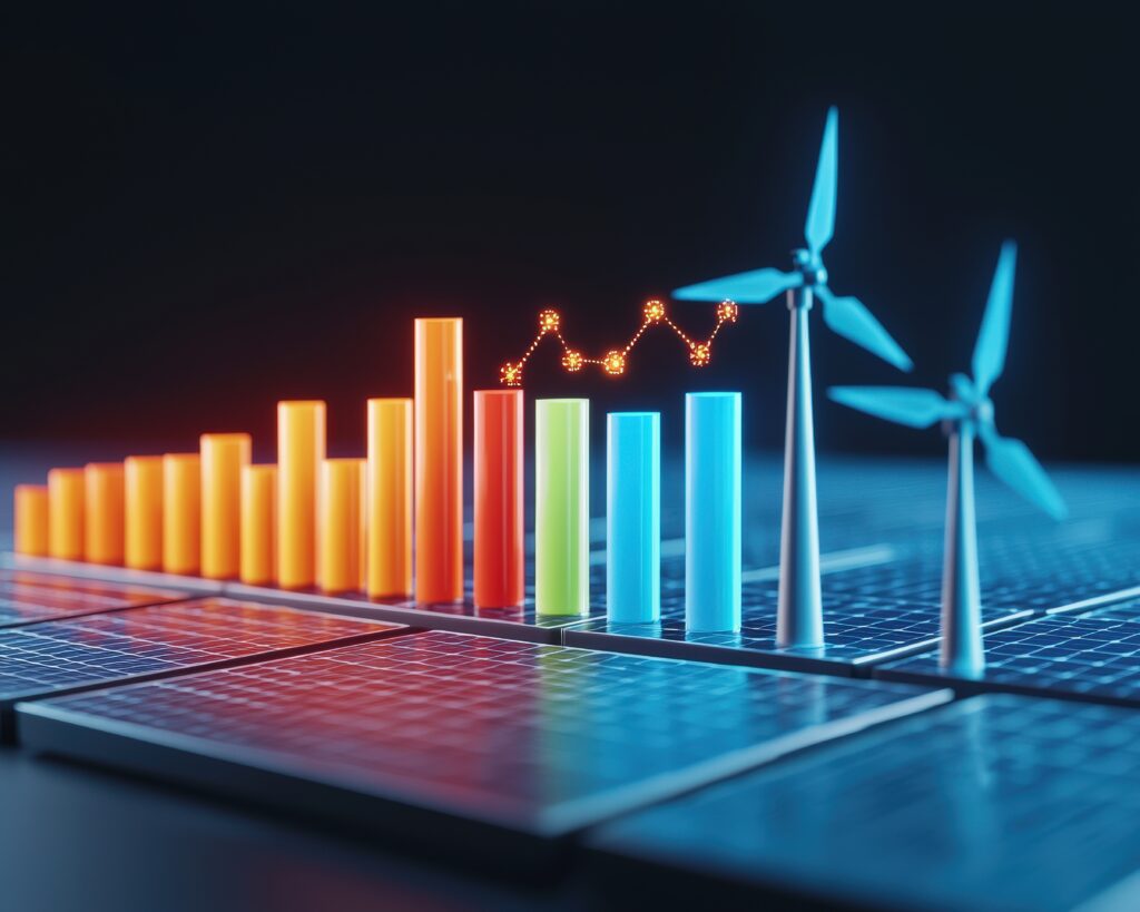 Visual representation of renewable energy trends featuring bar charts, solar panels, and wind turbines, symbolizing growth in sustainable energy sectors.