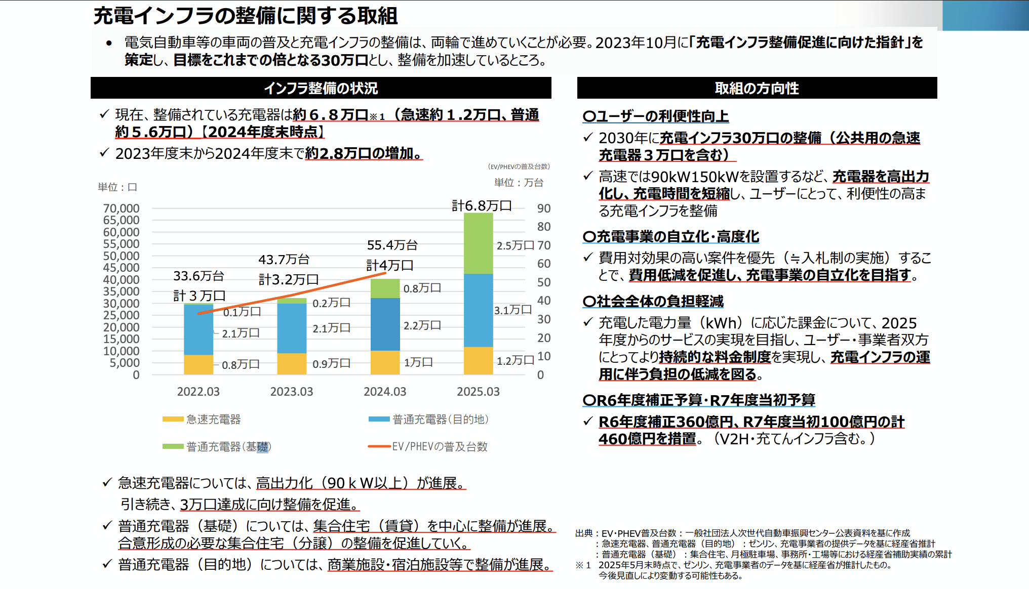 その中でもEVは、化石燃料に依存しないクリーンな移動手段として注目されていますが、一方でインフラ整備が課題となっています。政府は「2050年カーボンニュートラル」の実現を目指し、2035年までに新車販売の電動車(EV、HV、PHV等)比率を100%にすること、および2030年までに充電器設置数を30万口に増やすことを目標としています。
