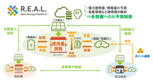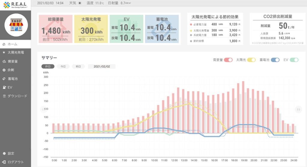 ・太陽光発電量及び電池の蓄電量と、店舗の電力使用量及びV2HからEVへの充電量を予測した上で、蓄電池からやEVからの放電により系統電力の使用量を減らす等して、店舗の電気料金を削減する。