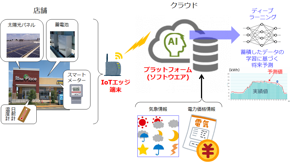 各店舗に設置されたスマートメーターや太陽光発電機、温度計 、日射計等に接続された「IoTエッジ端末」が、系統電力の使用量、太陽光発電量、屋根上温度 等のデータを収集し、4G回線でクラウド上の「プラットフォーム(ソフトウエア)」に送信する。