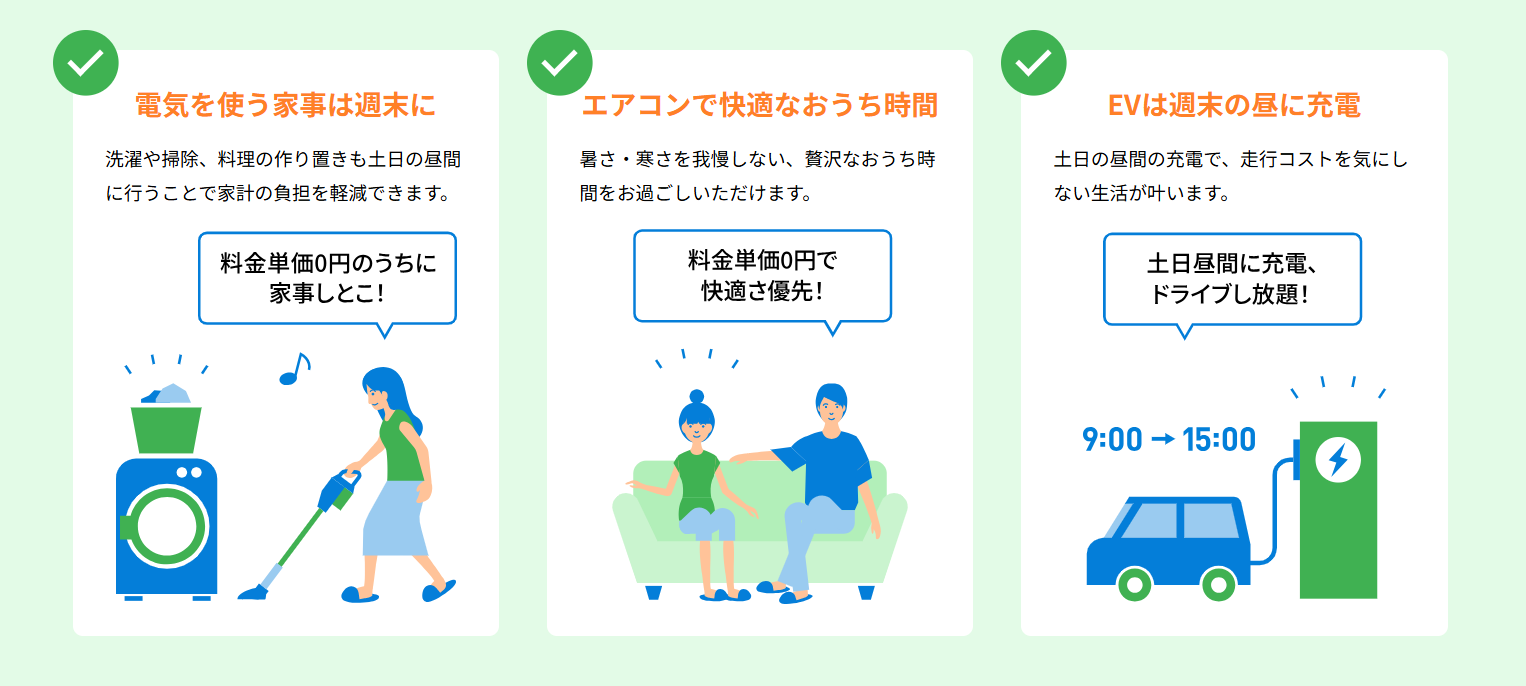 EV充電、エコキュート、洗濯乾燥、食洗機など電気を多く使う家電の使用を週末昼に動かせる家庭はぴったりです。