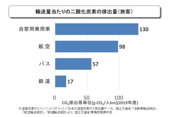 人間を1人運ぶときに出るCO2の量は、乗り物によって違います。一番大きいのはなんだと思いますか?つい、空を飛ぶ飛行機なのではないかとイメージしがちですが、一番は自家用車(130g-CO2/人km)なのです。続いて飛行機(98g)、バス(57g)、鉄道(17g)という順になっています。