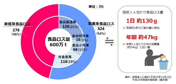 日本での食品ロス、つまり「本来食べられるのに捨てられてしまう食品」は、平成30年度で年間2,531万tあり、その中で「食品ロス」の量は年間600万t。これは日本人1人当たりの食品ロス量が1年で約47kg、日本人1人当たりにすると毎日お茶碗一杯分のご飯を捨てているのと同じ量になるそうです。