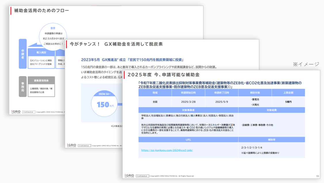 全90ページの大ボリュームで、いますぐ使える数億円規模の補助金はもちろんのこと、地方自治体が交付する補助金や、前年度の補助金実績まで網羅的に把握できます。GX推進法によって、脱炭素領域に多くの補助金が出されている今が、企業の脱炭素推進のチャンスです。ぜひ、ご活用ください。