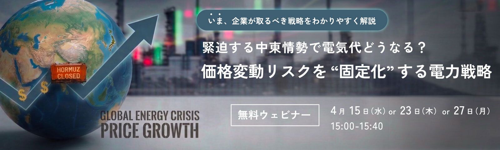 本ウェビナーでは、中東情勢が電気料金に与える影響と、2028年以降に重なる炭素賦課金・再エネ賦課金などの制度変更を踏まえ、